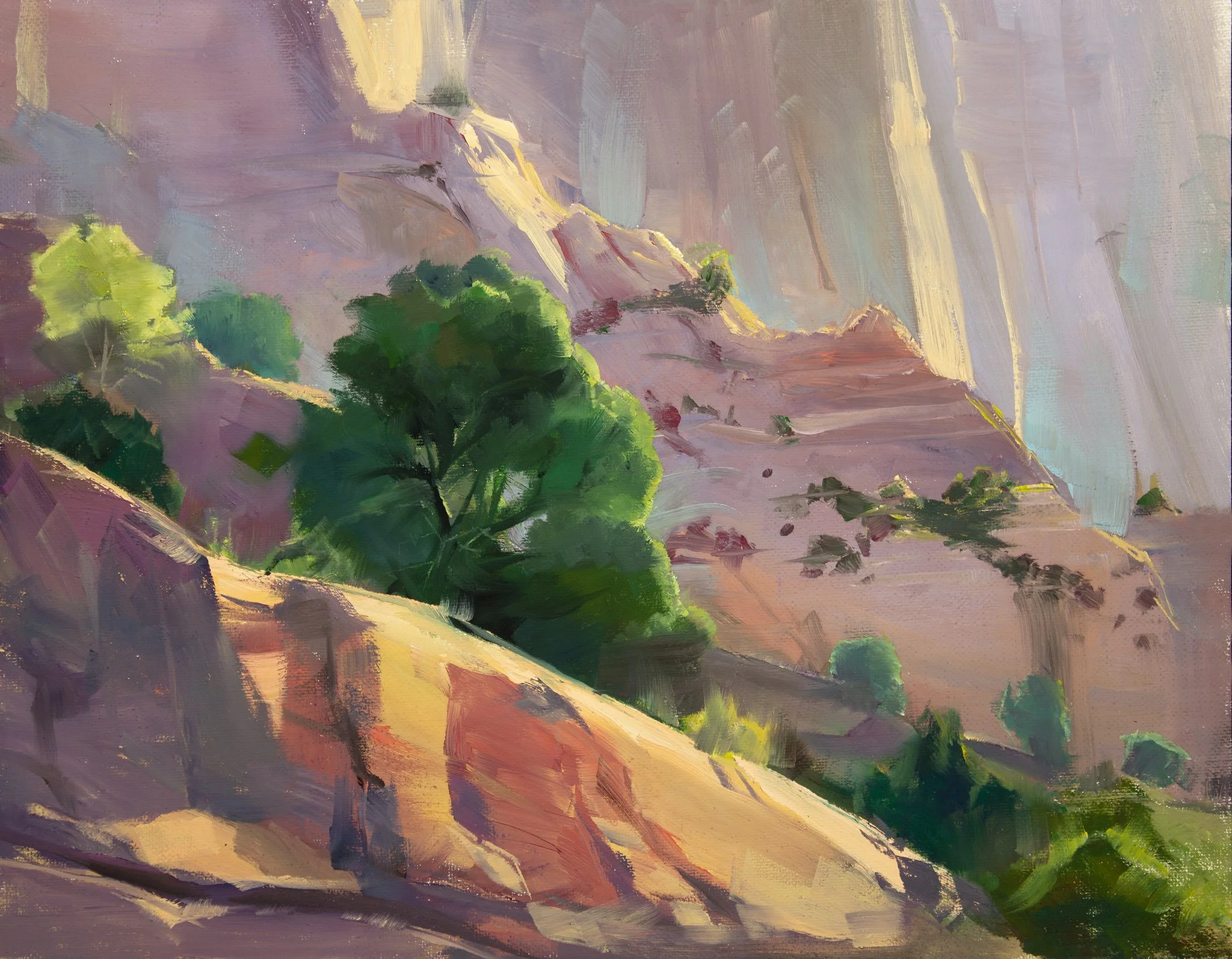 I begin with plein air studies to immerse myself in the environment. I'm fascinated by optics and the interplay of light on 3d forms and how oil paint along with brush marking can capture a realism and living quality to the work. I strive to keep this loose gestural quality in larger studio pieces.